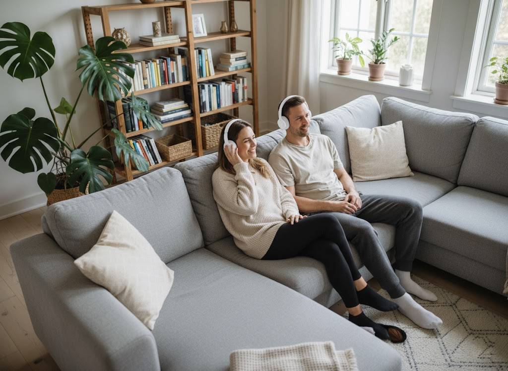 Sofa z odpornymi na plamy tkaninami i miękkie pufy na podłodze pozwalają na wspólne oglądanie filmów i swobodną zabawę. Materiały z powłoką teflonową czy polipropyleny są praktyczną inwestycją.